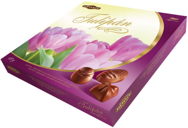 Szerencsi Tulipán csokoládé desszert 127g Hivatalos magyarországi forgalmazótól. Leírás: Cherry, mogyoró és rumos gesztenye ízű krémmel töltött desszert. Összetevők: Tejbevonó 50 %, Cukor, Hidrogénezett növényi zsírok, Sovány tejpor Zsírszegény kakaópor Emulgeálószer (szójalecitin), Aroma, Cherry ízű krém 18 % Cukor, Hidrogénezett növényi zsírok, Sovány tejpor,
