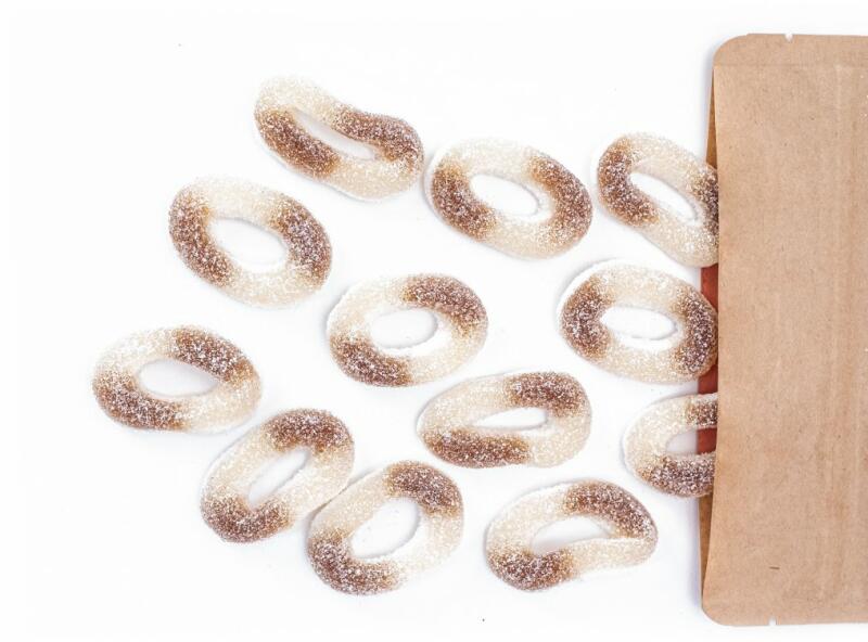 300 gramm Cola ízű savanyú karika. Részletes leírás: A savanyú kóla karikáink minőségi zseléből készülnek, amely autentikus kóla ízesítéssel van ellátva, és finom savanyú cukorral van bevonva. Ezáltal a karikák frissítő kombinációt nyújtanak az édes és savanyú ízek között, amely mind a gyerekek, mind a felnőttek körében népszerű. Minden karika puha, rágós