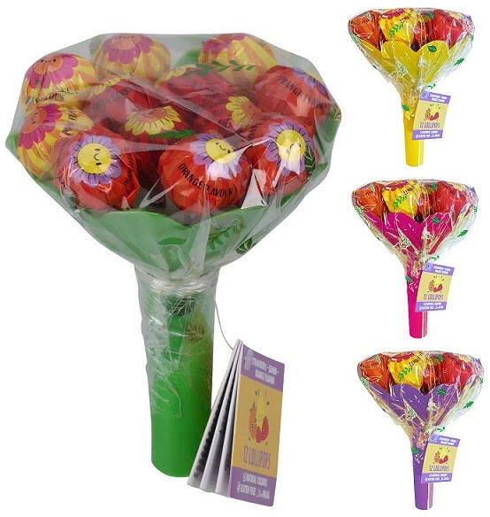 Nyalóka virágcsokor. töltőtömeg: 120g 12 darab 10grammos nyalóka található a csokorban nyalóka ízek: eper, citrom és narancs a csokor színei nem választhatóak, véletlenszerűen kerülnek feladásra Összetevők: Cukor, glükózszirup (szulfitok), savanyúságot szabályozó anyagok (E330, E296, E331), aromák, színezékek (E100, E162, E160c). Átlagos tápérték 100g-ban Energia 3