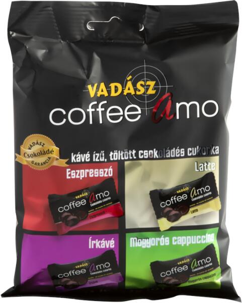 Vadász Coffee Amo 100g Kávé ízű cukorkák Hivatalos magyarországi forgalmazótól. Összetevők: Mogyorós cappuccino ízű cukorka: tejcsokoládé 31% (cukor, kakaóvaj, sovány tejpor, kakaómassza, tejsavópor, tejzsír, emulgeálószer: szójalecitin, E476, aromák), cukor, glükóz-szirup, instant kávé (0,82%), aromák, zsíros tejpor, növényi zsír (pálma), zsírszegény kakaópor