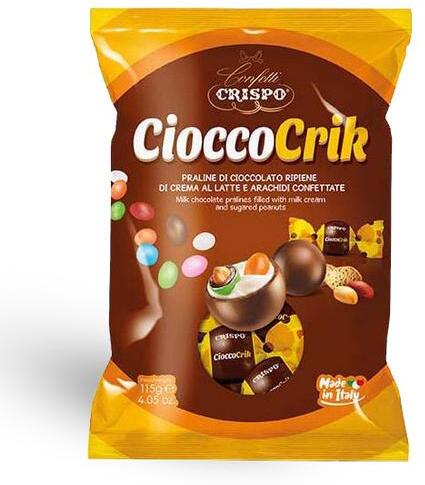 Crispo CioccoCrik - Drazséval töltött Praliné 115g Tejkrémes tejcsokoládé praliné pörkölt földimogyorós drazséval. A Crispo CioccoCrik - Drazséval töltött Praliné 115g előnyei Finom ízvilágú tejcsokoládé praliné. Pörkölt földimogyorós drazséval töltve. Kakaó szárazanyag: 28%. A CRISPO CIOCCOCRIK DRAZSÉVAL TÖLTÖTT PRALINÉ ELŐNYEI Finom ízvilág Pörkölt földi