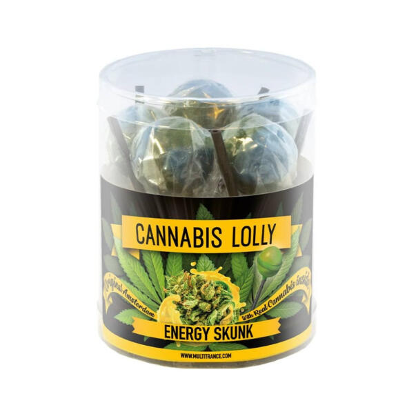Kender ízesítésű kannabisz nyalóka 10 db - THC-mentes Energy Skunk Kannabisz Nyalóka THC-mentes 100%-ig legális Kender ízesítés 17 g / nyalóka Összetevők: Glükóz szirup, cukor, savanyító szer (citromsav (E330)), ízesítés (kenderolaj), színezékek (E101, E132). Tápérték táblázat Tartal om 100 g termékben Egy adagban (17 g) Energia 1666 kJ / 392 kcal 283 kJ / 67 kcalZsír