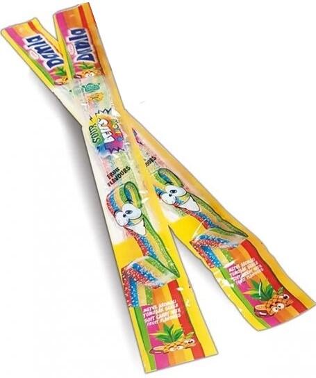Tayas Damla Sour Belt Rainbow Tropic 15g Savanyú gyümölcscsemege eredeti kivitelben Aroma: Trópusi gyümölcs, málna, szeder. Hozzávalók: Cukor, glükóz-fruktóz szirup, búzaliszt ( glutén ). Savanyúságot szabályozó anyag (citromsav E330, almasav E296). Dextróz, növényi olaj (pálma), nedvesítőszer (szorbit E420). Almalé koncentrátum, színezékek antocianin E163, béta-karoti
