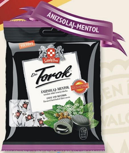 Ánizs és mentol tartalmú töltött keménycukorka. 75 g-os cukorka; Hungaropharma termék torokfájás és meghűlés ellen.