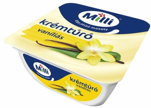 Vaníliás krémtúró. Utóhőkezelt, desszert jellegű túrókészítmény. 2,5 dl tej* * 90 g termékhez felhasznált tejmennyiség.