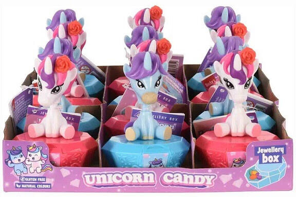Unikornis ékszerdoboz cukorkával. töltőtömeg: 10g az unikornis színei nem választhatóak, véletlenszerűen kerülnek feladásra Összetevők: cukor, módosított kukoricakeményítő, glükózszirup, sűrítőanyag (E407), savanyúságot szabályozó anyag (E296), aromák, fényezőanyag (E903), színezékek (E120, E141, E160a, E163). Átlagos tápérték 100 g-ban Energia 390kcal Zsír 0g