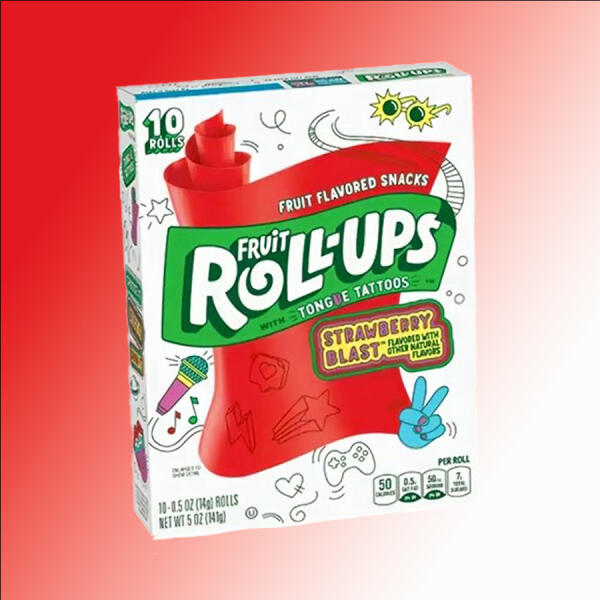 Fruit Roll Ups Strawberry felcsavarható eper ízű gumicukor tetoválással. töltőtömeg: 141g Összetevők: Kukoricaszirup, szárított kukoricaszirup, cukor, körtepüré koncentrátum, pálmaolaj. Legfeljebb 2%-ot tartalmaz: citromsav, nátrium-citrát, gyümölcspektin, monogliceridek, almasav, C-vitamin (aszkorbinsav), acetilezett monogliceridek, természetes aroma, színezék (E1292, E110