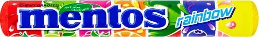 Mentos Rainbow gyümölcs rágócukorkák 37,5g Gyümölcsízű drazsé 30%-os rágható töltelékkel. Görögdinnye, málna, szőlő, cseresznye, narancs, ananász és eper ízekben. Hozzávalók: Gyümölcslevek koncentrátumból: Málna 2%, görögdinnye 2%, eper 2%, alma 2%, narancs 2%, grapefruit 2%, áfonya 2%. Cukor, glükózszirup. Kókuszolaj, Sav (citromsav), keményítő, aroma, maltod