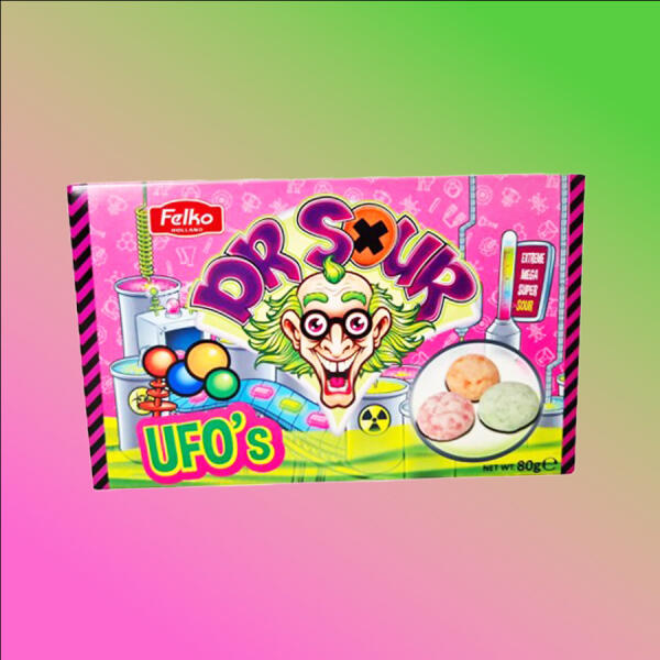 Dr Sour Ufo savanyú gumicukor. töltőtömeg: 80g Összetevők: cukor, dextróz, glükózszirup, víz, pálmaolaj, kukoricakeményítő, gumiarábik, savanyúságot szabályozó anyag (E330, E296), emulgeálószer (E473, E1450), aroma, színezékek (E100, E133). Átlagos tápérték 100g-ban Energia 370kcal Zsír 2,8g melyekből telített zsírsavak 0g Szénhidrát 86g melyekből cukrok 69g Fehé