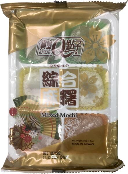 MOCHI MIXKiszerelés: 210 gÖsszetevők: maltóz 25%25, cukor, ragacsos rizs 20%25, sűrítő anyag E1442, vörösbab paszta (vörösbab, cukor, maltóz, pálmaolaj), taro paszta (taro, kardbab, cukor, maltóz, pálmaolaj), zöld tea por, pálmaolaj, aroma, tartósítószer E200, színezék E133, E102, E129. Azoszínezéket tartalmaz: E102, E129. A termék nyomokban tartalmazhat mogyorót és szez