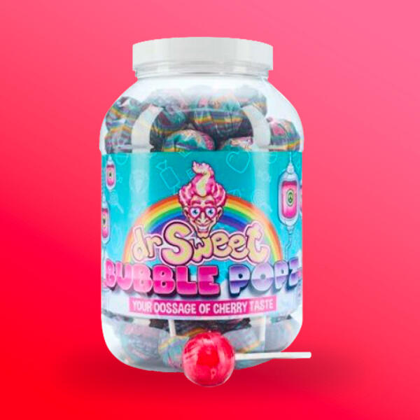 Dr. Sweet Bubble Popz cseresznyés nyalókák Töltőtömeg: 1,75kg 70 db Összetevők: cukor, glükózszirup, gumialap, savanyúságot szabályozó anyag (E330), nedvesítőszer (E422), aromák, színezék (E120). Átlagos tápérték 100g-ban Energia 381kcal Zsír 1,8g melyből telített zsírsavak 1,1g Szénhidrát 92g melyből cukrok 61g Fehérje 0g Só 0,4g
