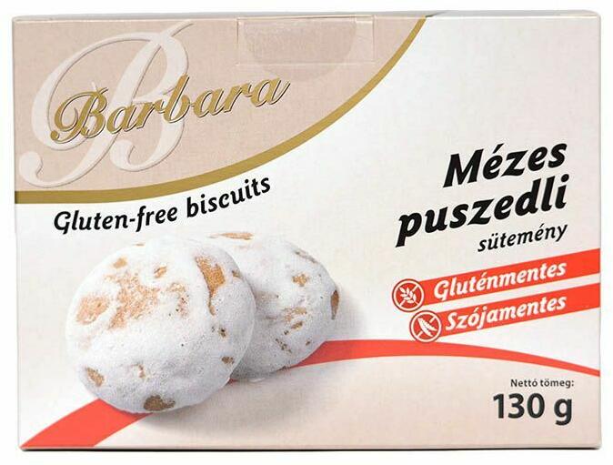 Barbara gluténmentes puszedli mézes 130g Mézes puszedli a gluténmentes édességek kedvelőinek. Lisztérzékenyeknek előállítva, gluténmentes mézes puszedli. Kiváló harapnivaló önmagában, vendégeknek vagy ünnepekkor. Összetevők: cukor, méz (25%), kukoricakeményítő, margarin (finomított növényi olajok és részlegesen hidrogénezett növényi zsírok, víz, emulgeálószer