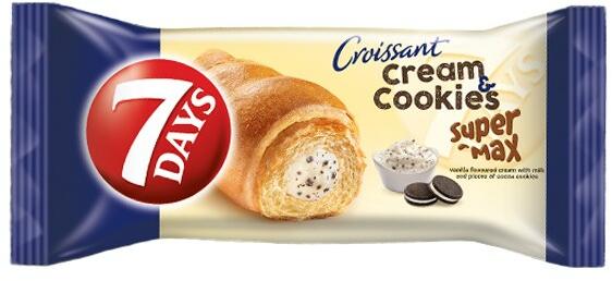 Croissant 7DAYS Super Max Cream&Cookies vanília ízű töltelékkel kakaós keksz darabokkal 110g - Fotoland fotó és irodaszer webáruház - Rendelj raktárról, 459-os áron. Gyors kiszállítás. Croissant Super Max vaníliás töltelékkel, kakaós keksz darabokkal. 110gr. Összetevők: Tészta: búzaliszt , növényi olajok (pálmaolaj, napraforgóolaj), cukor, glükóz-fruktóz szörp,