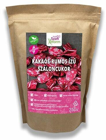 Szafi Reform Kakaós-rumos ízű szaloncukor 250g Kakaós rumos ízű szaloncukor étcsokoládéba (20%) mártva, édesítőszerekkel Hozzáadott cukrot nem tartalmaz. Természetes módon előforduló cukrokat tartalmaz. Vegán Gluténmentes Élelmi rostban gazdag 40 %-kal csökkentett szénhidráttartalom Étcsok oládé 20 %, kakaó szárazanyag az étcsokoládéban legalább 35 %. Összetevők: