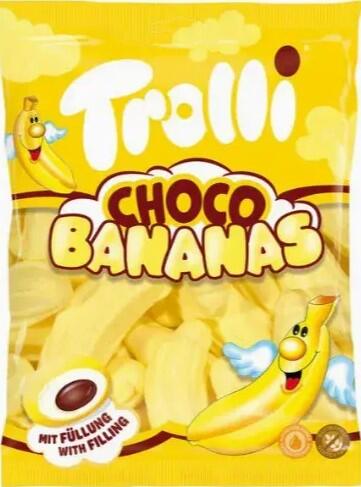 Trolli csokoládé-banán 150g Csokoládé banán ízletes, természetes gluténmentes mályvacukorkák. Csokoládé ízű banán... Hozzávalók: Glükóz szirup; cukor; vizet inni. Növényi olaj (napraforgó, pálma, gyapotmag, pórsáfrány, rizs). sertés zselatin; csökkentett zsírtartalmú kakaópor. Teljes tejpor; aromák; ételfesték (pórsáfrányfesték). Emulgeálószer: szójaleciti