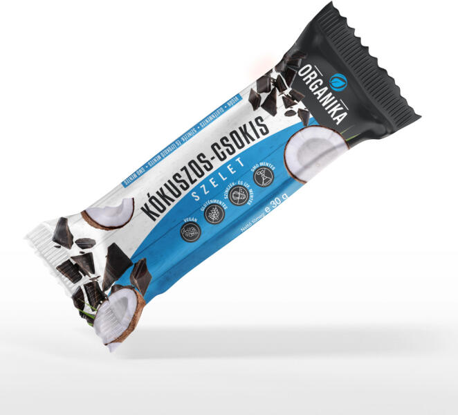 Organika kókuszos-csokis szelet 30 g Kókuszos csokis ízű szelet belga étcsokoládéba mártva, édesítővel. VEGÁN, glutén-, színezék-, ízfokozó-, GMO mentes termék. 0% hozzáadott cukor, csak természetes módon előforduló cukrokat tartalmaz. 50%-kal csökkentett szénhidráttartalommal rendelkezik, élelmi rostban gazdag, hozzájárul az egészséges bélflóra fenntartásához. K