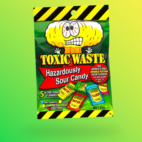 Toxic Waste Hazardously savanyú kemény cukorka töltőtömeg: 57g Összetevők: cukor, glükózszirup, citromsav, almasav, dextróz, aromák, maltodextrin, fényezőanyag, méhviasz, színezékek: E100, E141, E162. Átlagos tápérték 100g-ban Energia 359kcal Zsír 0g melyből telített zsírsavak 0g Szénhidrát 82,4g melyből cukrok 64,6g Fehérje 0g Só 0,16g Megtalálod így is: cukorka vá