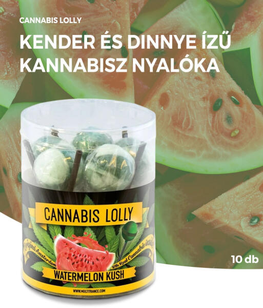 Kender és görögdinnye ízesítésű kannabisz nyalóka | 10 db Cannabis Lolly Watermelon Kush kannabisz nyalóka | 10 db Kóstold meg a THC-mentes kannabisz nyalókát, kender és görögdinnye ízesítéssel! Összetevők: glükóz szirup, cukor, savanyító szer (citromsav E330), ízesítés (kenderolaj), színezékek (E101, E132). Tápérték: Tartalom 100 g termékben Egy adagban (17 g) Ene