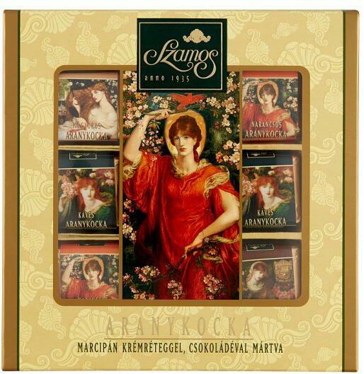 A díszdobozban 8 db Aranykocka található: 2-2 db narancsos, kávés, mogyorós és csokoládés. Átlagos tápérték 100 g termékben:Energia: 2114 kJ (506 Kcal)Zsír: 31,6 g ebből telített: 10,9 gSzénhidrát: 43,4 g ebből cukrok: 39,8 gFehérje: 9,2 gSó: 0,02 gTárolási információ: száraz, hűvös helyen tárolandó!Származási hely: Magyarország
