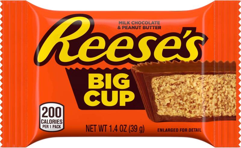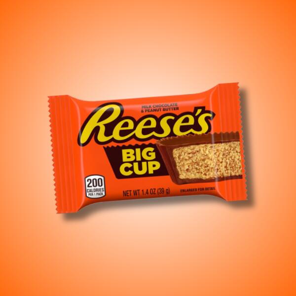 Reeses Big Cup mogyoróvajas tejcsokoládé 39g Töltőtömeg: 42g Összetevők: tejcsokoládé (cukor, kakaóvaj, kakaómassza, sovány tejpor, tejzsír, laktóz (tej), emulgeálószer, szójalecitin, poliglicerol-poliricinolát), mogyoró, cukor, dextróz, só, TBHQ, citromsav. Búzát és egyéb dióféléket feldolgozó üzemben készül. Átlagos tápérték 100g-banEnergia526kcalZsír28,5gme