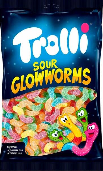 Trolli Sour férgek 1kg Gyümölcszselé férgek formájában. Hozzávalók: Glükóz szirup; cukor; módosított burgonyakeményítő. Élelmiszer-minőségű zselatin; savak: citromsav. Tejsav, almasav. Savanyúságot szabályozó anyag: kalcium-citrátok, nátrium-malát; aromák. Színezék: titán-dioxid, kármin, kurkumin. FCF ragyogó kék. Allergének: nincs megadva. Tápértékek 100 gram