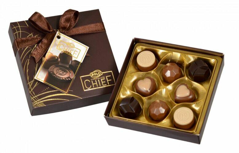 Bolci Chief Praliné Válogatás Fehér Díszdobozban 100g. Tej-, Ét- és Fehér csokoládé válogatás, vegyes töltelékkel töltve.