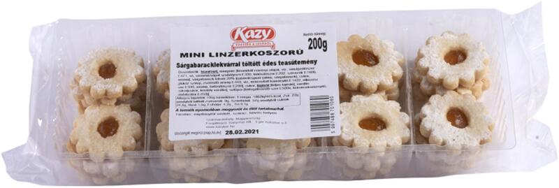 Kazy barackos linzer 200g Hivatalos magyarországi forgalmazótól. Összetevők: búzaliszt, margarin (finomított növényi olajok, víz, emulgeálószer E471, só, savanyúságot szabályozó E330, tartósítószer E202, színezék E160b, aroma), sárgabarack lekvár 20% (gyümölcspüré - alma, sárgabarack, cukor, glükóz szirup, zselésítő anyag E440, víz, módosított keményítő E142