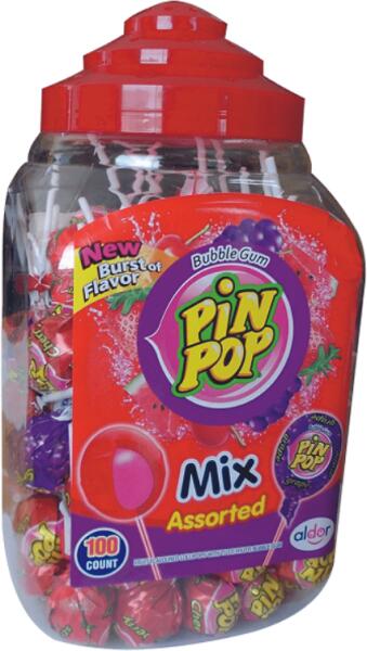Pin Pop nyalóka 100*18g Hivatalos magyarországi forgalmazótól. Összetevők: Cukor , Glükóz szirup, Gyümölcs püré (3%) (alma, cseresznye, eper, ananász, lime, citrom, málna, õszibarack, banán, narancs, áfonya, szeder, mangó, dinnye, kiwi), Étkezési savak (tejsav, almasav, citromsav), Aromák, Színezékek (E 100, E 160c, E 162) Tápértékre vonatkozó adatok: Energia: 1645 kJ/38