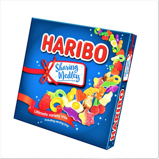 Haribo Sharing Medley gumicukor válogatás. töltőtömeg: 480g Összetevők: Fizzy, és gyümölcsös ízű gumicukrok, cola, tejes, habcukor: glükóz szirup; Cukor; dextróz; Zselatin; Gyümölcslé koncentrátumból: alma, fekete ribizli, citrom, narancs, ananász, eper; Karamellizált cukorszirup; Savak: citromsav, almasav; Savanyúságot szabályozó anyagok: kalcium-citrátok, nátrium-hid