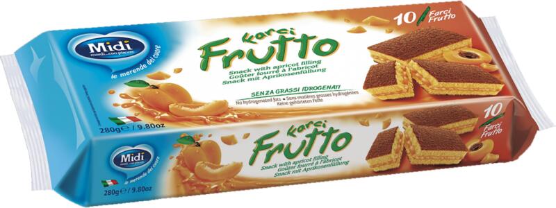 Midi Piskóta Sárgabarack 10x28g Hivatalos magyarországi forgalmazótól. Leírás: Töltött piskóta szelet Összetevők: cukor, búzaliszt, friss tojás, növényi olajok és zsírok (pálma), glükóz-fruktóz szirup, sárgabaracklé (4,9%), sovány tej, sovány tejpor, tejfehérje, aromák, emulgeálószerek: zsírsavak (pálma) mono- és digliceridjei, szójalecitin, térfogatnövelő szer