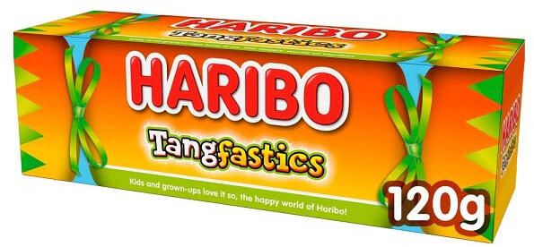 Haribo Tangfastics gumicukor válogatás. töltőtömeg: 120g Összetevők: Glükózszirup, cukor, zselatin, dextróz, savak: citromsav, almasav, savanyúságot szabályozó anyagok: kalcium-citrátok, nátrium-hidrogén-malát, karamellizált cukorszirup, gyümölcs- és növényi koncentrátumok: alma, arónia, feketeribizli, sárgarépa, bodza, szőlő, hibiszkusz, Kiwi, citrom, mangó, narancs