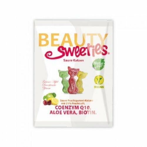 Beauty Sweeties gluténmentes vegán gumicukor cicák 125 g Nassolj a szépségért! Savanyú gyümölcsös gumicukor cicák 25 % gyümölcslével, Q10-koenzimmel, aloe verával és biotinnal. Vegán termék sosem volt még ennyire finom! Glutén-, zsír-, laktóz-, tartósítószer- és zselatinmentes. Mesterséges színezéket és ízfokozót nem tartalmaz. Biotin: 150 g (300% RI*) *RI=Napi bevi