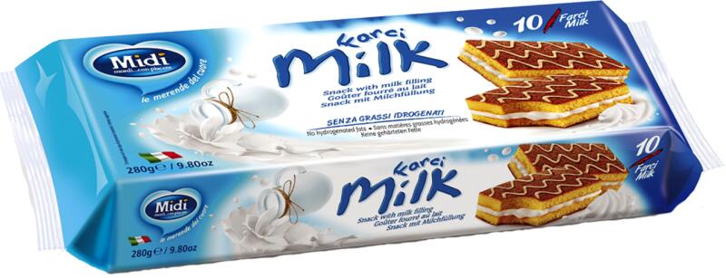 Midi Piskóta Milk 10x28g Hivatalos magyarországi forgalmazótól. Leírás: Töltött piskóta szelet Összetevők: cukor, búzaliszt, övényi olajok és zsírok(pálma), glükóz-fruktóz szirup, tej(5,2%), sovány tej(3,5%), sovány tejpor(2,6%), tejfehérje, aromák, emulgálószerek:zsírsavak(pálma) mono-és digliceridjei, szójalecitin, térfogatnövelő szerek:ammónium-karbonátok, ná