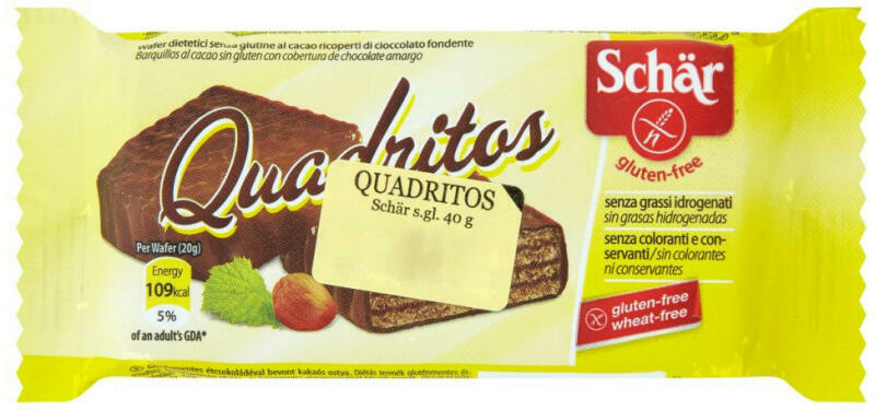 Schär Quadritos étcsokoládéval bevont kakaós ostya 40 g Gluténmentes finomság kakaós töltelékkel és étcsokoládé bevonattal. Összetevők: étcsokoládé 42% - kakaó min. 50% (cukor, kakaómassza, kakaóvaj, emulgeálószer: szójalecitin, természetes aroma), burgonyakeményítő, cukor, növényi zsír(pálma, pálma mag), szójaliszt, kakaó 5%, mogyoró 2%, emulgeálószer: szój