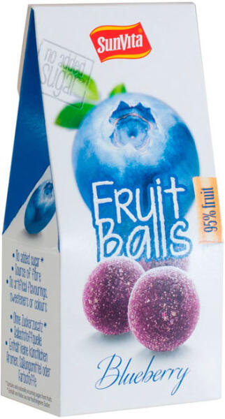 Sunvita kékáfonyás gyümölcsgolyó kékáfonyapor borításban, mely 95% gyümölcstartalmú élelmi rost forrás. Nem tartalmaz hozzáadott cukrot, mesterséges aromát, édesítőszert és színezéket. Kizárólag a gyümölcsökben természetes módon előforduló cukrokat tartalmaz. Összetevők: datolyapaszta, mazsola, aszalt szilva (tartósítószer: kálium-szorbát), almatöret, növ