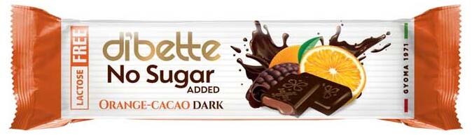 Dibette Nas laktózmentes narancsos étcsokoládé 22g Hivatalos magyarországi forgalmazótól. Leírás: narancs ízű krémmel töltött étcsokoládé édesítőszerekkel Összetevők: étcso koládé 65% (kakaómassza, édesítőszer: eritrit, szteviol-glikozidok (0,02%), kakaóvaj, emulgeálószerek: napraforgó lecitin, poliglcerin-poliricinolát, aroma), narancsízű kakaós krém 35% (nem
