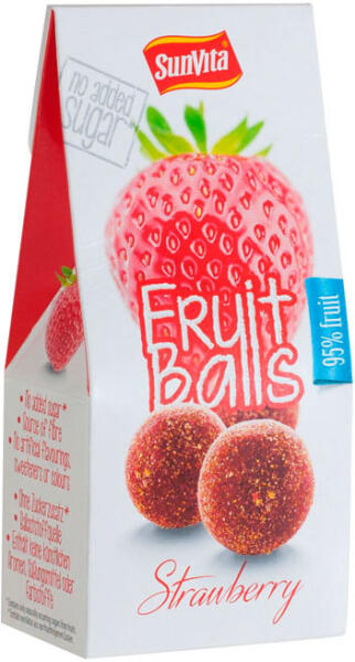 Sunvita gyümölcsgolyó epres 80 g A Sunvita epres gyümölcsgolyó eperpor borításban, mely 95% gyümölcstartalmú élelmi rost forrás. Nem tartalmaz hozzáadott cukrot, mesterséges aromát, édesítőszert és színezéket. Kizárólag a gyümölcsökben természetes módon előforduló cukrokat tartalmaz. Összetevők: datolyapaszta, mazsola, aszalt szilva (tartósítószer: kálium-szorb