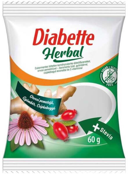 DIABETTE HERBAL CUKORMENTES TÖLTETLEN KEMÉNYCUKORKA ORVOSI PEMETEFŰ-BORSMENTA ÍZZEL 60Gédesítőszerek: izomalt, maltitok, étkezési sav: citromsav, vitamin: L- aszkorbinsav, aromák, őrölt gyömbér (2%), gyógynövény kivonatok: csipkebogyó kivonat (1%), orvosi pemetefű kivonat (0,018%), színezék: paprika kivonat, ammónium-szulfitos karamell, édesítőszer:szteviol-glikozidok (0,0