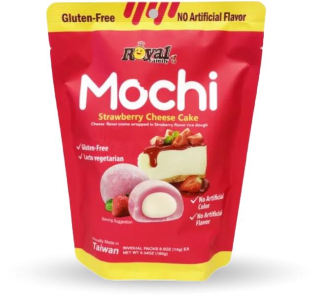 Élvezze a japán mochi és epres sajttorta ízletes kombinációját Royal Family Mochi epres sajttorta. Ez a finomság puha külső rizsréteggel rendelkezik, epres sajttortával töltve. Minden falat az édes eper és a sajttorta ízének tökéletes keveréke. Összetevők: Rizsliszt, cukor, víz, eper aroma, krémsajt, tej, vaj, tojás, só, élelmiszer színezékek, tartósítószerek.