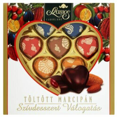 Szamos töltött marcipán szívdesszert válogatás 10 db. Csokoládékrémmel-, narancskrémmel-, szilvakrémmel-, megykrémmel töltött marcipán szivek csokoládéba mártva. A termék k is mennyiségben alkoholt tartalmaz! Szerezz örömet szeretteidnek, válaszd az Ajándékküldés opciót! Ez egy igazi meglepetés lehet!Amennyiben az ajándékküldési opciót választod, akkor a bonbont