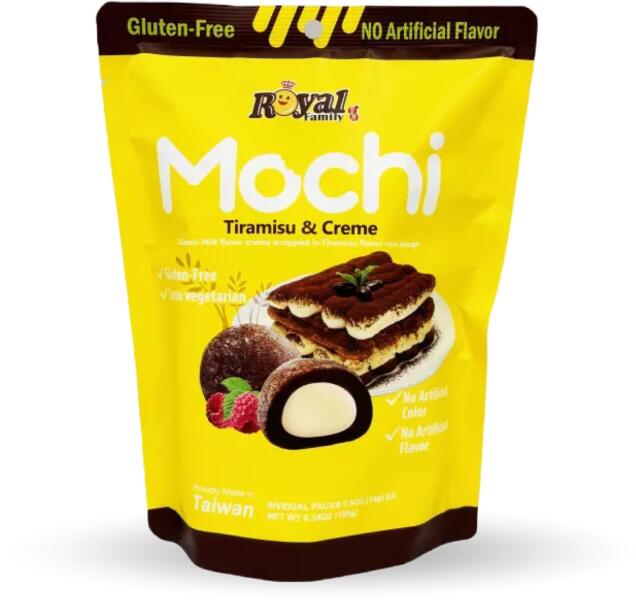Élvezze a japán mochi és a klasszikus olasz tiramisu tökéletes kombinációját a Royal Family Mochi Tiramisu & Creme-vel. Ez az elragadó finomság puha rizstésztával rendelkezik, amely gazdag, krémes tiramisu ízű töltelékkel van megtöltve. Tapasztalja meg a kávé, a kakaó és a krémes finomság harmonikus keverékét minden falatban. Összetevők: Rizsliszt, cukor, víz, káv