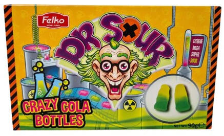 Dr Sour Crazy Cola Bottles savanyú gumicukor. töltőtömeg: 90g Összetevők: glükózszirup, cukor, zselatin (marhahús), savanyúságot szabályozó anyag (E330, E296), sűrítőanyag (pektin), karnaubaviasz, növényi olaj, aroma, színezékek (E100, E133). Átlagos tápérték 100g-ban Energia 347kcal Zsír 0g melyekből telített zsírsavak 0g Szénhidrát 79g melyekből cukrok 67g Fehérje