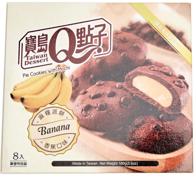 BANÁN MOCHI COOKIESKiszerelés: 160 gÖsszetevők: búzaliszt 28%25, ragacsos rizs 18,9%25, stabilizátor E471, maltóz, cukor, barna cukor, margarin (pálmaolaj, só, szójalecitin, aroma, béta-karotin), tojás 2%25, tejpor, banán por 1,98%25 (banán püré, maltodextrin, almalé, aroma), csokoládé chips (cukor, pálmaolaj, kakaó por, dextróz, szójalecitin, aroma), sütőpor, só, aroma,