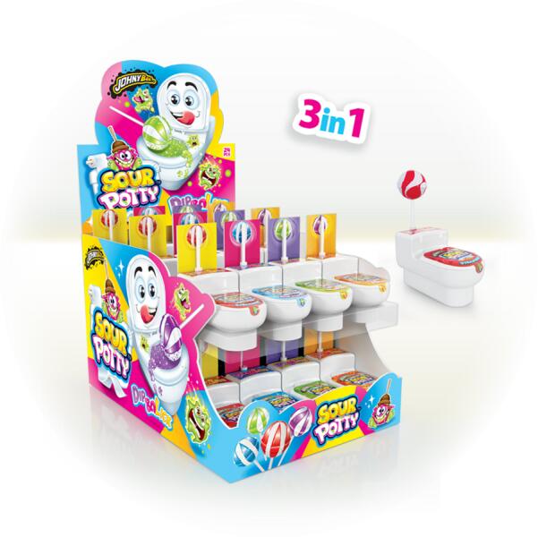 John bee sour pottya WC alakú nyalóka 24x19g Hivatalos magyarországi forgalmazótól. Leírás: Gömbnyalóka mártogatós cukorkával, wc alakú csomagolásban Kék málna, zöldalma, eper és kóla ízben kapható. Kiszerelés: 24 x 19 g