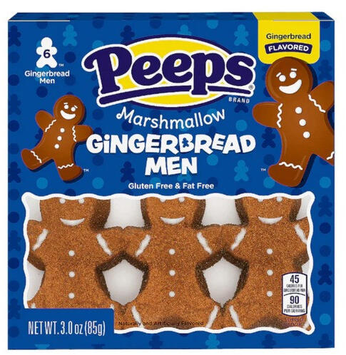 Peeps Marshmallow Gingerbread Men mézeskalács formájú mályvacukor. töltőtömeg: 85g Összetevők: cukor, kukoricaszirup, zselatin, 0,5%-nál kevesebbet tartalmaz a következőkből: természetes és mestérséges maltodextrin, yellow 5 (tartazin), red 40, yellow 6, blue 1. Átlagos tápérték 100g-ban Energia 533kcal Zsír 0g melyből telített zsírsavak 0g Szénhidrát 85g melyből cukro