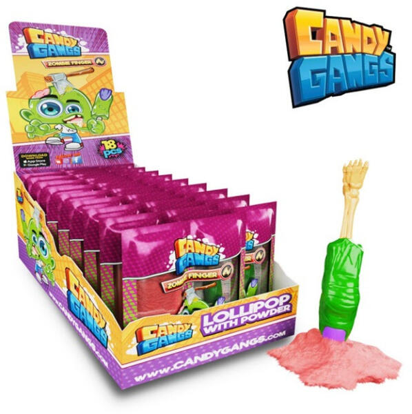 Candy Gangs Zombie Finger zombi ujj mártogatós nyalóka. töltőtömeg: 35g Összetevők: préselt cukorkapor (dextróz, savanyúságot szabályozó anyag: citromsav E330; maltodextrin, glükózszirup, csomósodást gátló anyag: zsírsavak magnézium sói E470b; aroma, színezék: E163), nyalóka (cukor, glükózszirup, aroma, kukoricakeményítő, marhahús zselatin, színek: E100, E133, E163