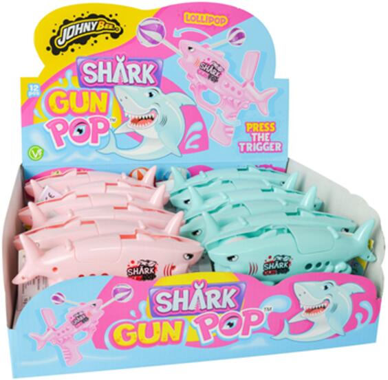 Johny Bee shark gun pop pisztoly és nyalóka 12x10g Hivatalos magyarországi forgalmazótól. Leírás: Kiszerelés: 12x10g Összetevők : Cukor, glükózszirup, aromák, színezék (E163, E133). Tápértékre vonatkozó adatok: Átlagos tápérték 100g termékben: Energia: 1639kJ/392kcal Zsír: 0g ebből telített zsírsavak: 0g Szénhidrát: 98g Ebből cukrok: 88g Fehérje: 0g só: 0g