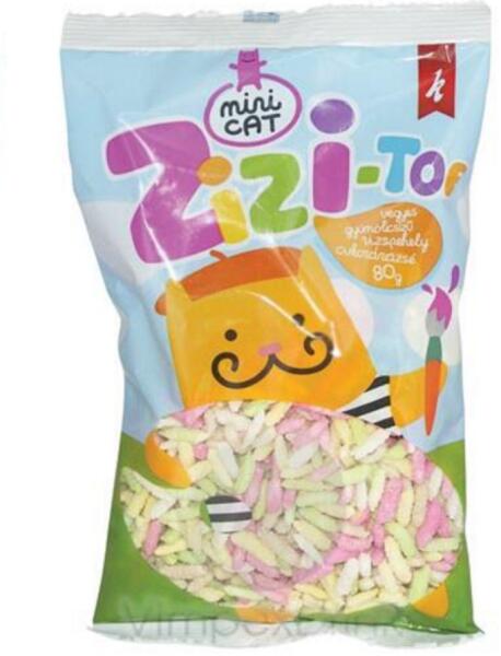 Mini Cat zizi-zop 70g Hivatalos magyarországi forgalmazótól. Összetevők: Cukor, puffasztott rizs (25%), glükóz szirup, természtes szinezékek: karotin, kurkumin, kárminok, klorofillok és klorfillinek rézkomplexei, egyszerü égetett cukor, savanyüságot szabályozó anyag: citromsav, aromák, étkezési só. Tápértékre vonatkozó adatok: 1605 kj / 378 kcal zsír 0,3 g telített zsí