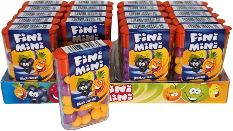Fini Mini fekete ribizli-trópusi gyümölcs ízű cukorka drazsé 16g Hivatalos magyarországi forgalmazótól. Leírás: Kiszerelés: 16g