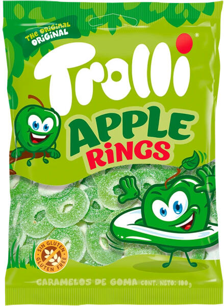 Kis édes nasira vágysz? Egyél egy kis almakarika formájú gumicukrot! Almakarika formájú gluténmentes gumicukor a Trolli-tól.